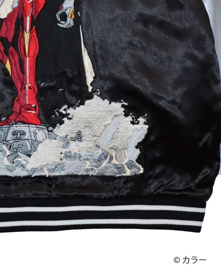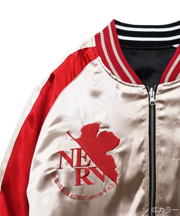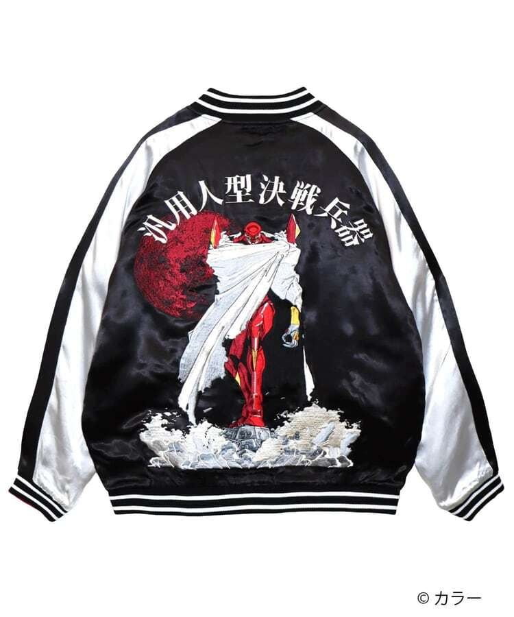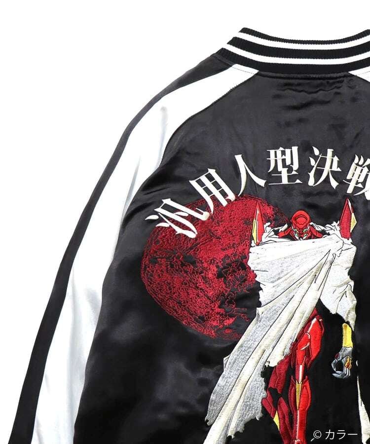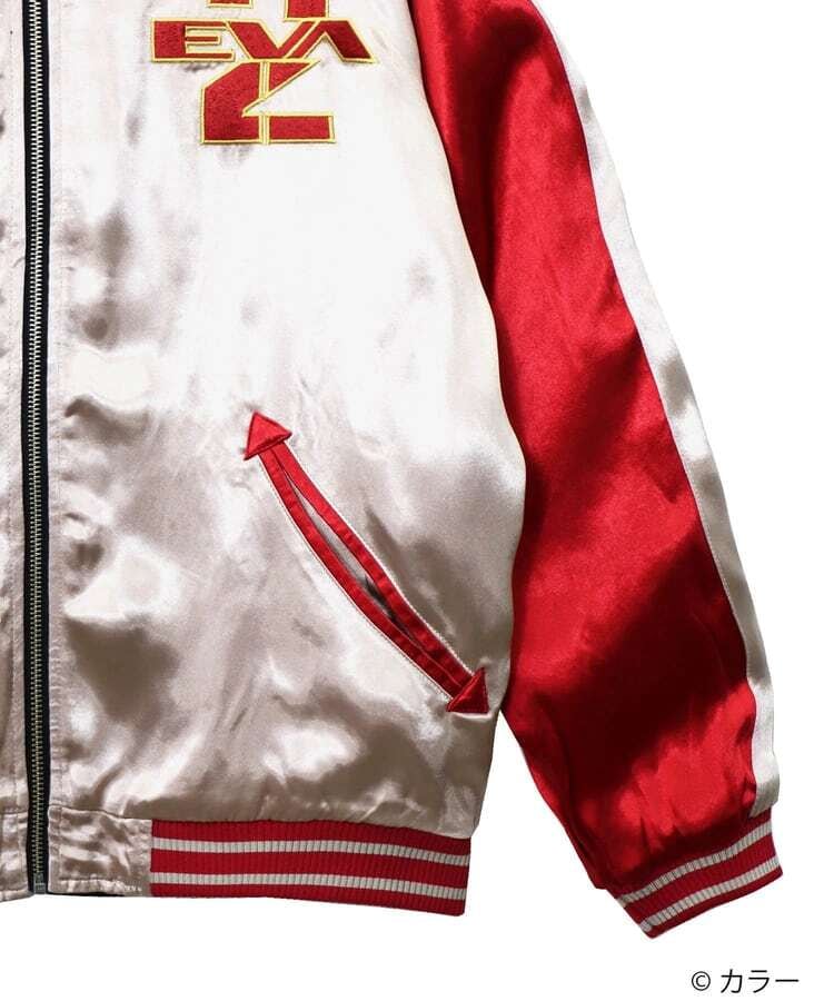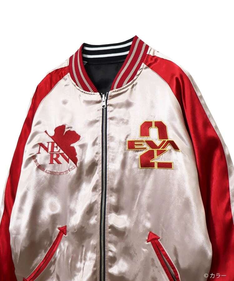 『新世紀エヴァンゲリオンTV版』にて、マントに身を包んで洋上の戦艦の上に乗った状態で初登場となるEVA弐号機をバックモチーフとして描きました。マントの陰影や波のしぶきなどグラデーションとなる部分を繊細な刺繍糸の選択により、臨場感あふれる一枚に仕上げました。フロントにはNERVマークをオマージュし、TVのタイトルロゴを『弐』の一文字と組み合わせたデザインを配置しました。全てのデザインは、職人技が光る刺繍技術で施しております。その刺繍の一針一針は、長年スカジャンの刺繍を行ってきた匠の技として、価値のある逸品として完成されています。